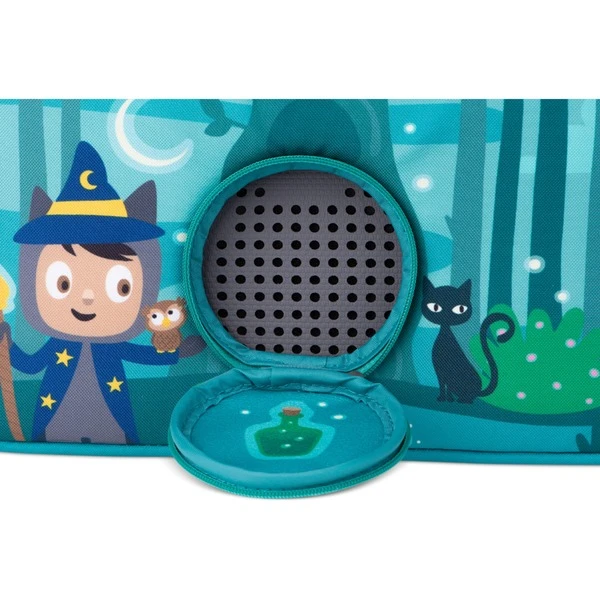 | Feature | Verstecktes Detail auf der Innenseite der Lautsprecherklappe, Toniebox Öffnung/Lautsprecherklappe, Trennstege (wegklappbar, Klett), Aufhängung (Haken), Platz für Toniebox, Ladestation, Kopfhörer… | ||
